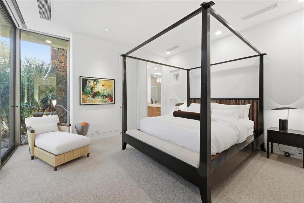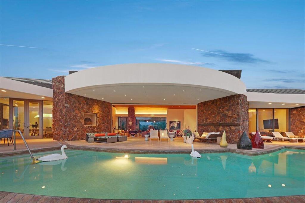 As the ultimate expression of the world-renowned Rancho Mirage lifestyle, this exceptionally luxurious estate presents a rare opportunity in the intimate guard-gated enclave of Waterford. Crafted by Stoker Builders from a design by visionary architect Narendra Patel, the custom showplace focuses on the relationship between an artistically conceived residence and the landscape that it inhabits. Soaring barrel ceilings trimmed in natural wood planks, white limestone and wide-plank wood floors, and unending walls of floor-to-ceiling windows and doors blend harmoniously with natural light and water views. Bold rock walls hint at the region's famous Mid-Century Modern heritage, while contemporary appointments and carefully integrated updates make this a home for today and long into the future. An expansive single-level floorplan extends approximately 7,374 square feet and reveals five ensuite bedrooms-each with outdoor access, and eight baths. The great room takes center stage, with clerestory windows, a fireplace, 18' ceiling and a vast wall of disappearing glass pockets doors opening to the backyard and pool views. A separate wet bar, large formal dining room with patio, office with built-in cabinetry and desk, and a casual family room flow easily, catering to upscale and low-key entertaining. The estate's curvilinear walls lend visual drama, and nearly every room offers direct access or views to the outdoors. Like the home's baths, its kitchen was completely reimagined from the ground up to create a more cohesive flow throughout. Chefs will appreciate a double-waterfall island with prep sink, frameless white cabinetry with hidden hardware, a skylight, quartz countertops with full backsplash, circular breakfast nook and top-tier Thermador appliances. Rivaling nearby resorts, the primary suite welcomes beautiful views into a private realm enriched with a sitting area, patio, barrel ceiling, two opulent baths and dual walk-in closets. Powered by 100 solar panels, this uncompromising residence continues to impress with a Control4 home automation system, patinaed metal roof, custom lighting and a three-car garage. The homesite is one of the community's largest at approximately 31,799 s.f., providing generous room for a resort pool and spa surrounded by a virtual palm oasis, private patios, and a main patio for entertaining, complete with a high-end outdoor kitchen. Available for only the second time in its storied history, this estate can now be yours.