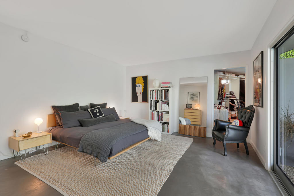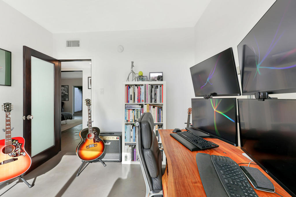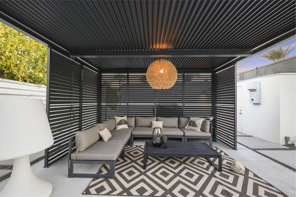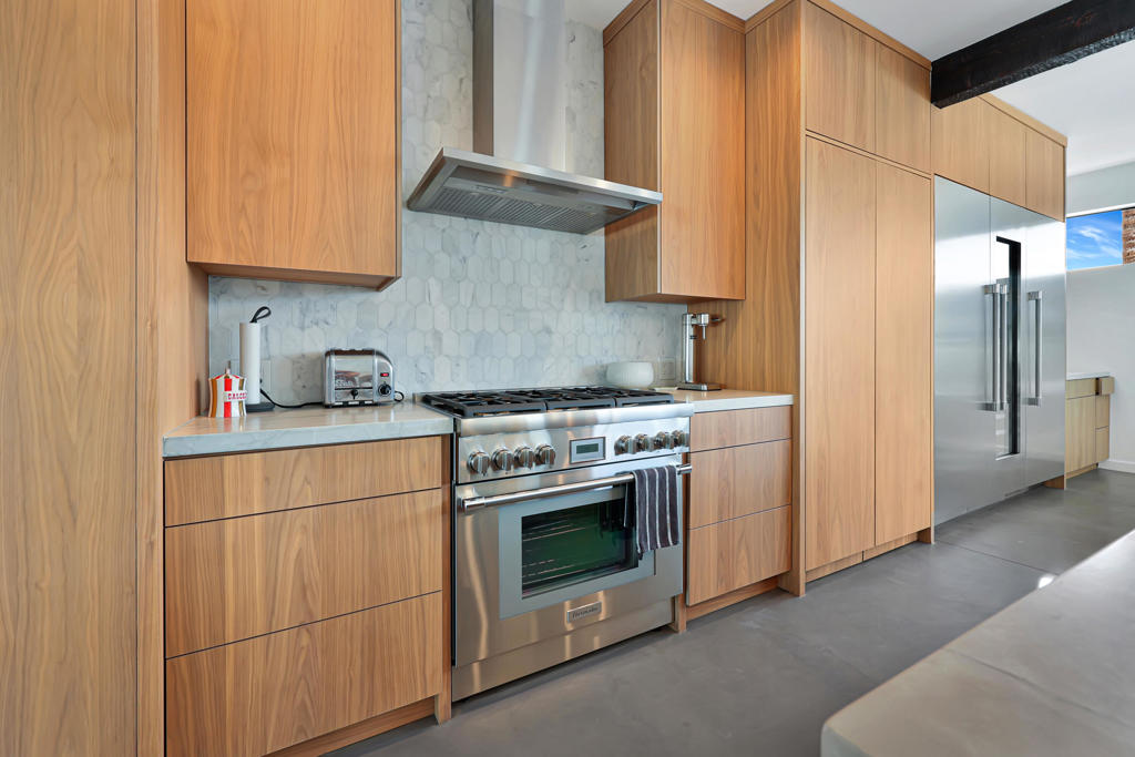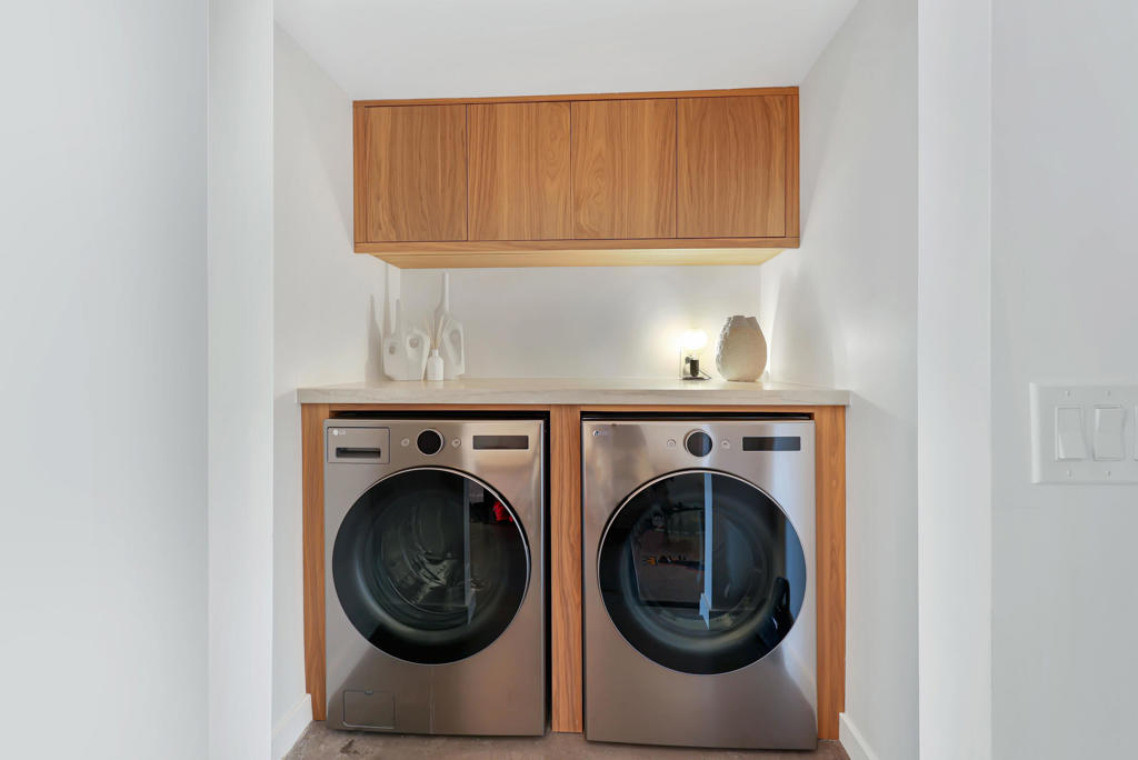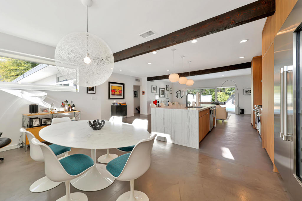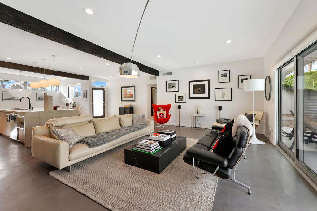 Palm Springs is renowned worldwide for its incomparable portfolio of stunning Mid-Century Modern homes, with tourists visiting throughout each year to see these unique, rare and coveted residences in person. Located on a premium corner homesite with breathtaking views of Mount San Jacinto, this newly upgraded 1961 Wexler & Harrison offers an exceptional opportunity for MCM aficionados to live their dream every day in the desirable neighborhood of El Rancho Vistas Estates. The home reveals an enviably private interior that extends approximately 1,809 square feet and includes three bedrooms and two baths. A frosted-glass entry door with transom window above opens to a seamless and light space that effortlessly combines living, dining and kitchen areas. Bathed in natural light that streams through a sliding-glass door and large picture window, the living room offers generous space for parties, celebrations and carefree relaxation. Clerestory windows allow mountain views to be enjoyed in the dining room, which flows directly to a new fully remodeled high-end kitchen. Anchored by a dual-waterfall island with quartz countertop and seating, the designer kitchen showcases European-style custom wood cabinetry, a trio of sleek pendent lights and a full tile backsplash. A suite of top-tier Thermador appliances includes a six-burner range, dishwasher, under-counter drawer microwave, and a full-height beverage cooler flanked by a custom built-in refrigerator on the left and matching freezer on the right. A hidden cabinet-matched door provides discreet access to the attached two-car garage with glass roll-up door and a laundry room with quartz countertop, cabinetry and brand-new LG washer and dryer set. All bedrooms open to the outdoors, with one offering extra room for an office or sitting area, and the primary suite opening to the backyard from the bedroom and the bath. Polished concrete flooring is featured throughout, and beamed ceilings and recessed LED lighting are on display. Behind-the-scenes systems are led by solar power with Tesla battery, an EV charger, brand-new Lennox and Mitsubishi AC systems, new pool equipment and a new roof. Steel fencing, new landscaping and custom lighting enrich outdoor spaces that host a pool, spa and custom resort-style pergola. Gas lines are pre-plumbed for a fire pit and BBQ, and the oversized driveway accommodates three or more cars.