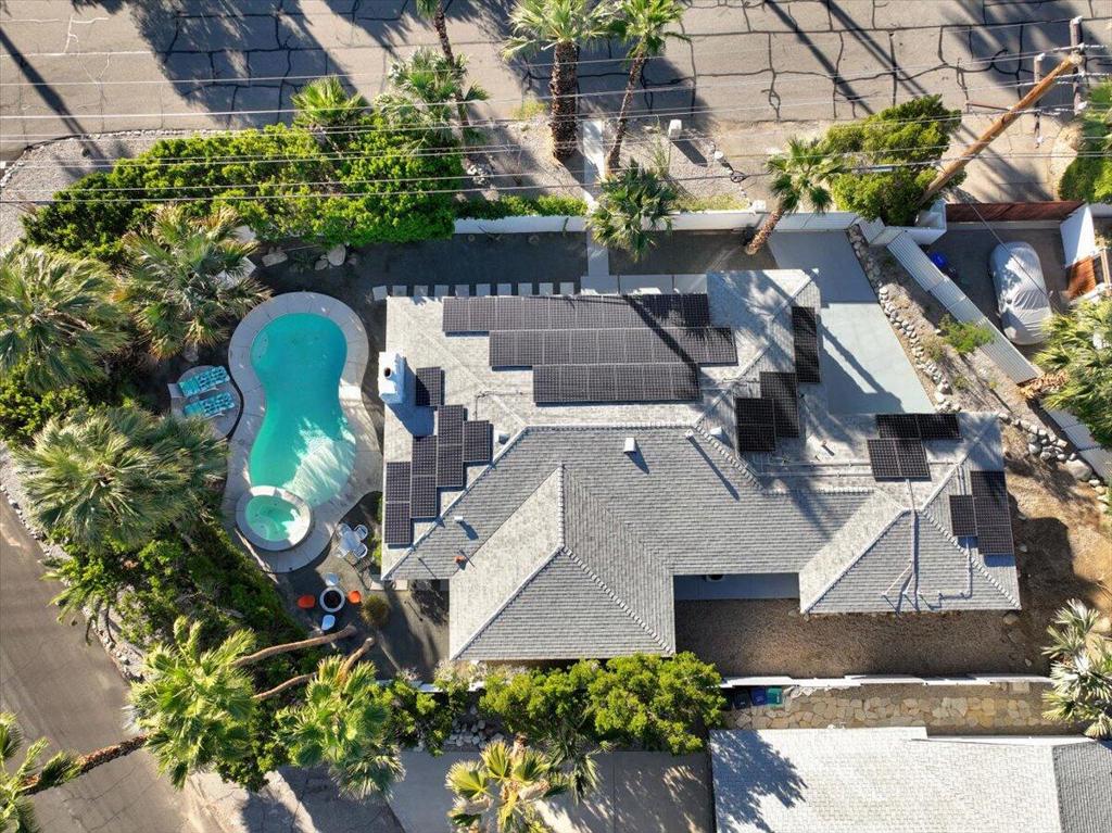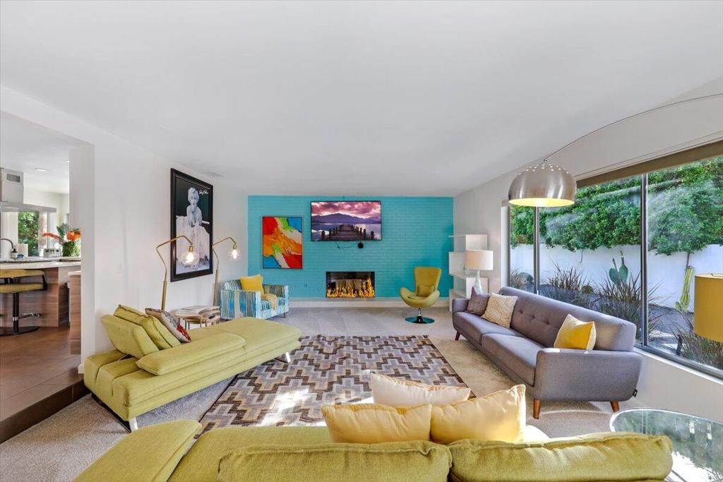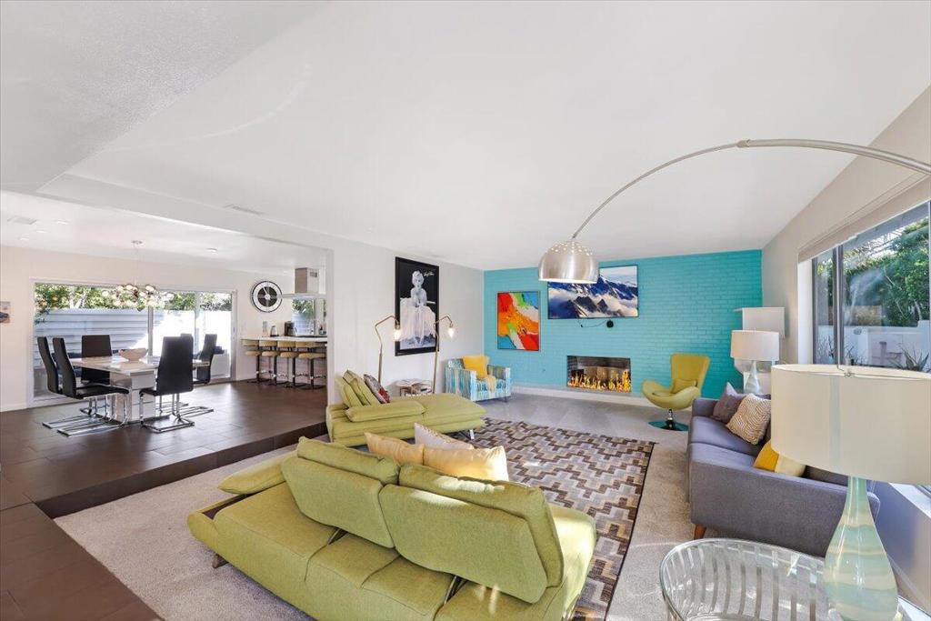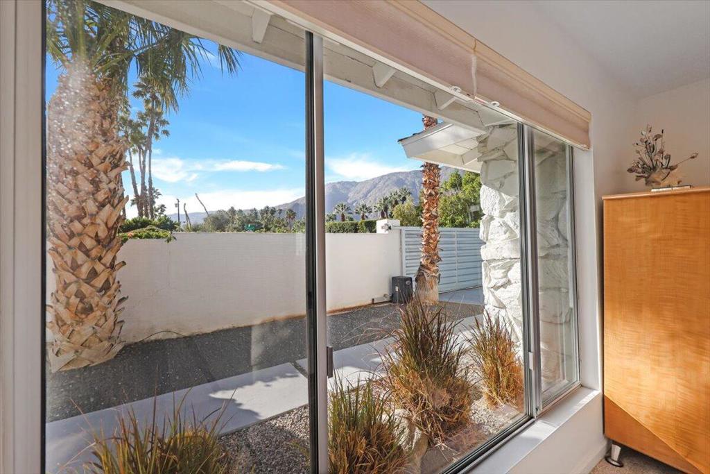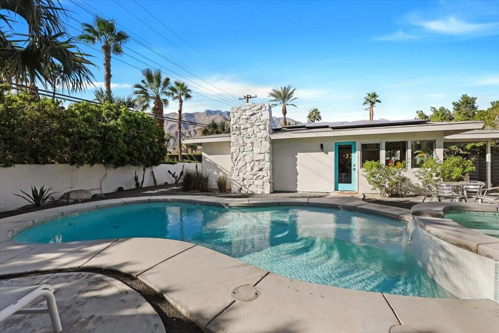 Dramatic mountain views, an extra-private and spacious corner lot, and a coveted location on the border of Palm Springs' Little Tuscany and Chino Canyon neighborhoods are merely the beginning of the advantages you will enjoy at this move-in-ready Mid-Century home. Sequestered behind gates and manicured hedges, the residence maintains its original 1968 appeal while carefully layering contemporary enhancements. It easily accommodates full-time desert living and has been featured as a successful vacation rental. Approximately 1,697 square feet, the three-bedroom, two-bath single-level floorplan is bright and open, with a foyer leading to a generous step-down living room anchored by a fireplace with wall-to-wall brick surround and a raised hearth. The dining room simplifies entertaining by offering a floating dry bar with wine storage, and direct flow to the living room, covered rear patio and kitchen. Wrapped in windows and professionally remodeled, the kitchen enhances meal prep with quartz countertops, sleek custom cabinetry, a long peninsula bar and a French door leading to the pool. Stainless steel appliances include a built-in French-door refrigerator and five-burner cooktop with hood above. Two bathrooms display large-format polished-stone floor tile and shower surrounds, floating vanities and, in the primary suite, two sinks. The owners suite is further enhanced with a sitting area and a large window with impressive mountain views. Two secondary bedrooms are also featured, including one with patio access. Powered by a rooftop solar system, this welcoming home is appointed with an attached two-car garage, on-trend tile and carpet, Mid-Century-inspired lighting fixtures, recessed lighting and custom paint. Custom metal gates open to the driveway and main entrance, while the expansive yard hosts a classic kidney-style pool with tanning shelf, spa and spillway. The fashionable restaurants, shops and resorts located within Palm Springs' Uptown Design District are moments away, and downtown is enviably convenient.
