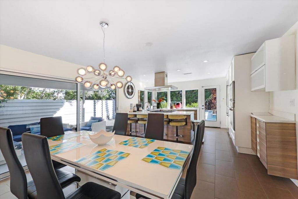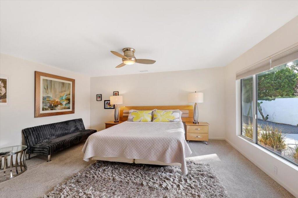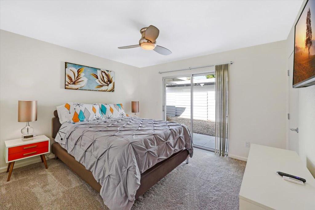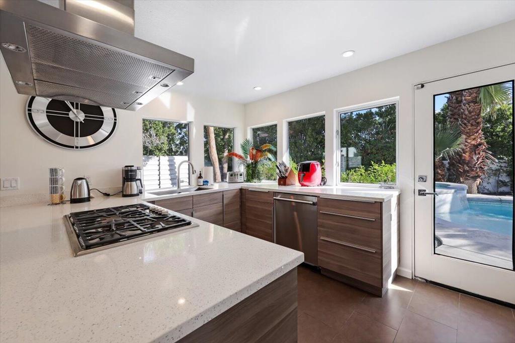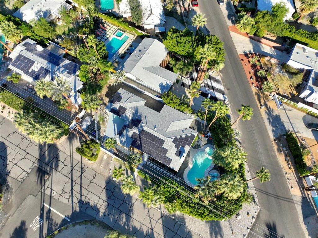 Dramatic mountain views, an extra-private and spacious corner lot, and a coveted location on the border of Palm Springs' Little Tuscany and Chino Canyon neighborhoods are merely the beginning of the advantages you will enjoy at this move-in-ready Mid-Century home. Sequestered behind gates and manicured hedges, the residence maintains its original 1968 appeal while carefully layering contemporary enhancements. It easily accommodates full-time desert living and has been featured as a successful vacation rental. Approximately 1,697 square feet, the three-bedroom, two-bath single-level floorplan is bright and open, with a foyer leading to a generous step-down living room anchored by a fireplace with wall-to-wall brick surround and a raised hearth. The dining room simplifies entertaining by offering a floating dry bar with wine storage, and direct flow to the living room, covered rear patio and kitchen. Wrapped in windows and professionally remodeled, the kitchen enhances meal prep with quartz countertops, sleek custom cabinetry, a long peninsula bar and a French door leading to the pool. Stainless steel appliances include a built-in French-door refrigerator and five-burner cooktop with hood above. Two bathrooms display large-format polished-stone floor tile and shower surrounds, floating vanities and, in the primary suite, two sinks. The owners suite is further enhanced with a sitting area and a large window with impressive mountain views. Two secondary bedrooms are also featured, including one with patio access. Powered by a rooftop solar system, this welcoming home is appointed with an attached two-car garage, on-trend tile and carpet, Mid-Century-inspired lighting fixtures, recessed lighting and custom paint. Custom metal gates open to the driveway and main entrance, while the expansive yard hosts a classic kidney-style pool with tanning shelf, spa and spillway. The fashionable restaurants, shops and resorts located within Palm Springs' Uptown Design District are moments away, and downtown is enviably convenient.