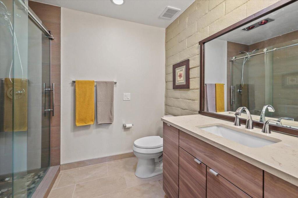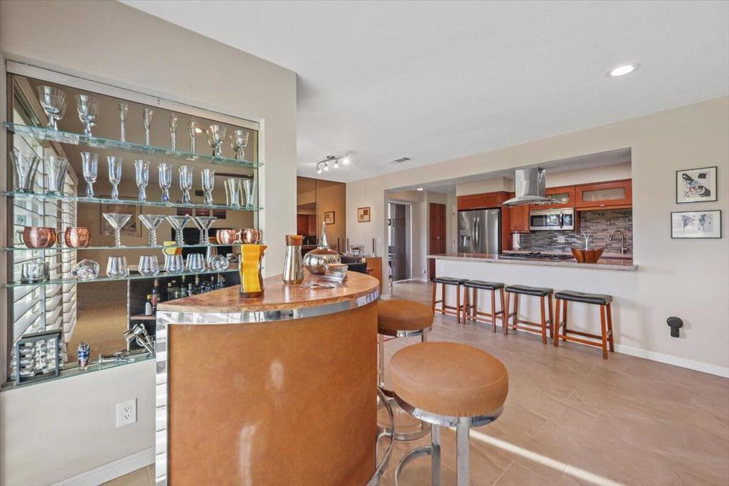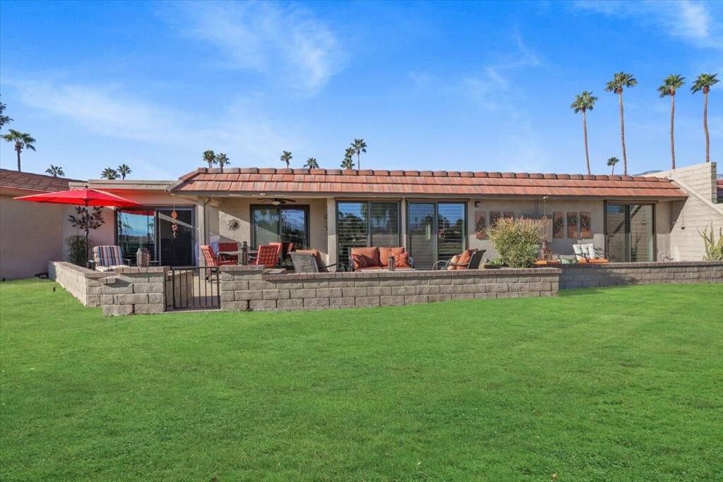 Completely reimagined and impeccably upgraded, this extensively customized condo offers an outstandinglocation in the heart of Cathedral City's gated Cathedral Canyon Country Club. This single level unit is perfectly located at the end ofan intimate cul-de-sac, steps away from one of many community pools, and a stone's throw from the Tennis Center and golf clubhouse featuring a regulation length 18 hole course, Direct access to the new CV Link bike path right from within the community. The gated entry courtyard withbeautiful mountain views creates the ideal spot for morning coffee. An expansive wraparound back patioborders the lush fairways of the community's 18-hole golf course and embraces vast vistas of rolling turf anda shimmering lake. Indoors, two bedrooms, two baths, a den with courtyard access, and a custom bonusroom/office that opens to the rear patio are revealed in approximately 1,736 square feet. Walls werereconfigured to create a seamless space that enriches daily living and effortless entertaining. A custom MidCentury-inspired entry door leads to living and dining rooms that frame scenic views through windows andsliders opening to the patio. Chefs of all skill levels will appreciate an open kitchen with peninsula bar,handsome stained-wood Shaker cabinetry, solid-surface countertops, a full tile backsplash and preferredstainless steel appliances. Both bedrooms provide patio access, and the primary suite hosts frosted-glasswardrobe doors and an ensuite bath with custom walk-in shower. Recessed LED lighting, contemporarylighting fixtures and solar-tube skylights illuminate the home, while custom paint, designer floor tile, ceilingfans and plantation shutters lend upscale flair. Upgraded dual-paned sliders throughout, newer HVAC, a split AC unit inthe bonus room, and a newer roof with recent re-coat enhance energy efficiency. Outdoors, the patio andcourtyard decking was resurfaced to look like stone. The Cathedral Canyon Tennis Club and clubhouse aresteps away, and the gated enclave features countless pools, parks and pathways. This residence isperfect as a lock-and-go vacation getaway and a wonderful year-round home. Downtown Cathedral City'sshops and restaurants, Palm Springs, Rancho Mirage and Palm Desert are all within easy reach, and milesof hiking trails, scenic parks and even a surf club are moments away