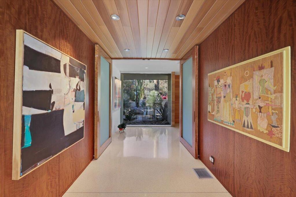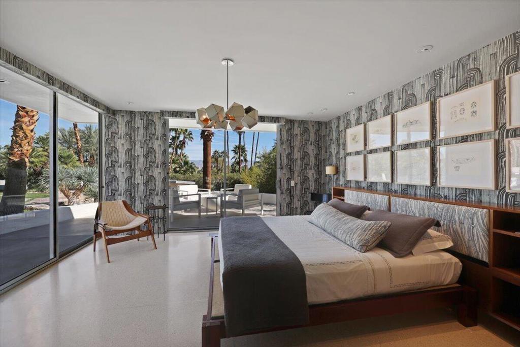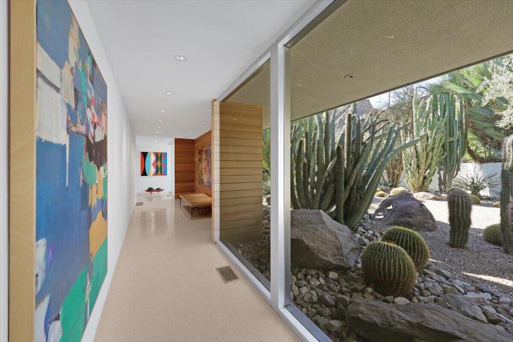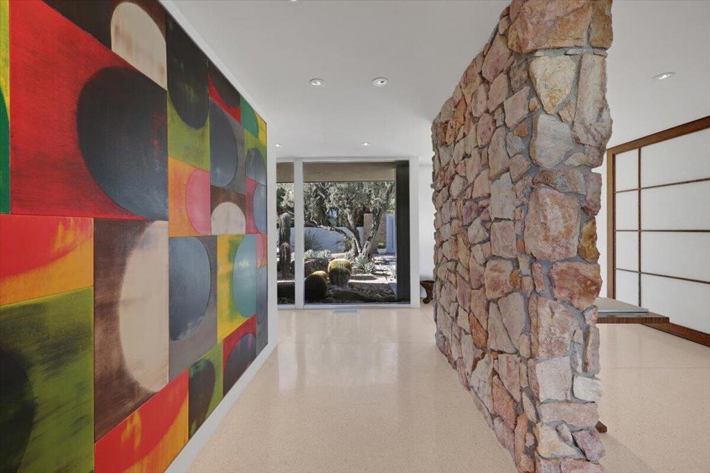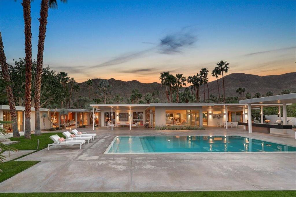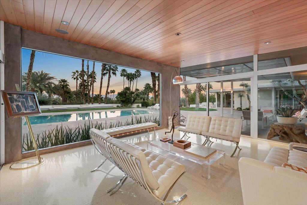 Extensively remodeled, restored and embellished by an owner with a keen eye for impeccable Mid-Century Modern design, this 1957 Thunderbird Heights estate in Rancho Mirage is available for the first time in more than 17 years. The turnkey residence includes premium furnishings, complete with vintage, bespoke and designer pieces. Walled and gated, private grounds extend approximately 32,670 square feet and cater to memorable entertaining with a zero-edge pool with Baja entry, spacious patios, a shade pavilion and sweeping mountain and valley views. Inspired landscaping reveals the talents of Marcello Villano, who has created stunning gardens including those at Jennifer Aniston's Bel Air home. Interiors framed in walls of glass measure nearly 4,900 square feet and host five bedrooms and five- and one-half baths. Renowned throughout the Coachella Valley, architect Howard Lapham created the single-level residence, which offers outstanding scale and impressive interiors from designer Sheldon Harte. Views to the backyard and beyond greet guests in the foyer, which introduces gallery-sized living areas with high ceilings, poured-in-place terrazzo flooring throughout, original stone walls, Venetian plaster and custom lighting. The living room displays a fireplace and beautiful vistas, an intimate den presents a walk-in wet bar and leather-paneled wall, and the kitchen blends period style with modern convenience. Details include cedar ceilings in select locations, furnishings from Knoll, Artemide light fixtures, glass tiles imported from Italy, and Kelly Wearstler wallpaper. Showcased on the pages of ELLE Decor, this era-defining home treats everyone to comfort and privacy. A detached two-room guest house is privately situated close to the outdoor amenities. The primary suite offers two bathrooms, a stainless-steel soaking tub, cork-lined dressing room, and an exterior patio with rain shower. The estate's exceptionally exclusive address within guard-gated Thunderbird Heights is moments from Thunderbird Country Club's famous 18-hole golf course, and only minutes from downtown Palm Springs, its international airport, and endless recreational opportunities across the valley.
