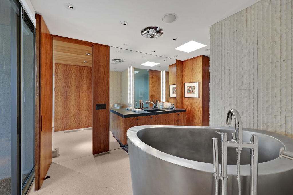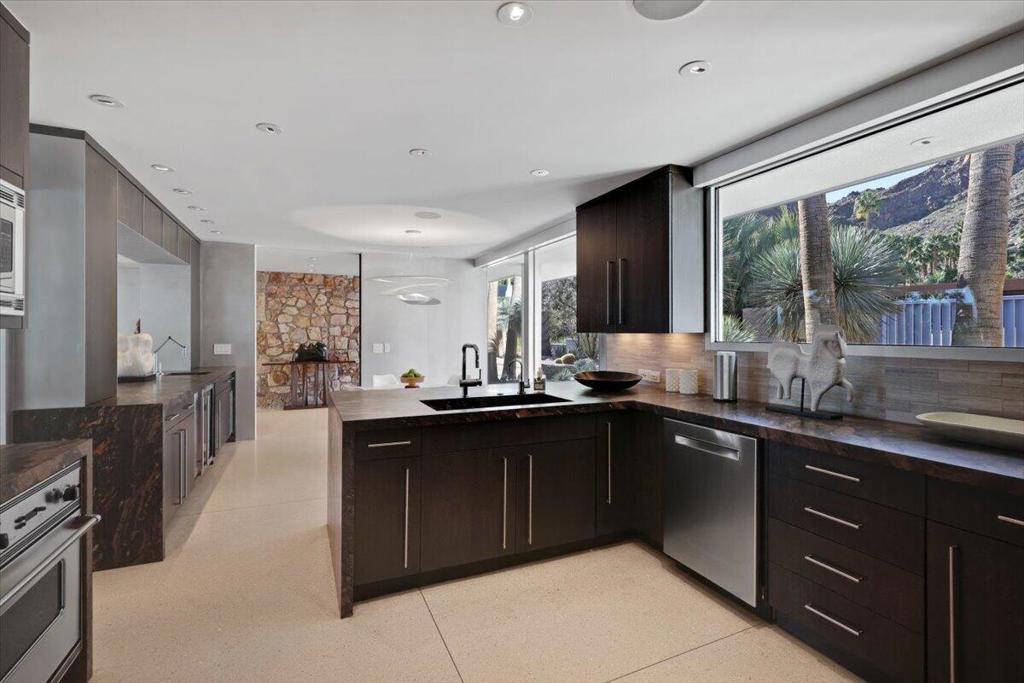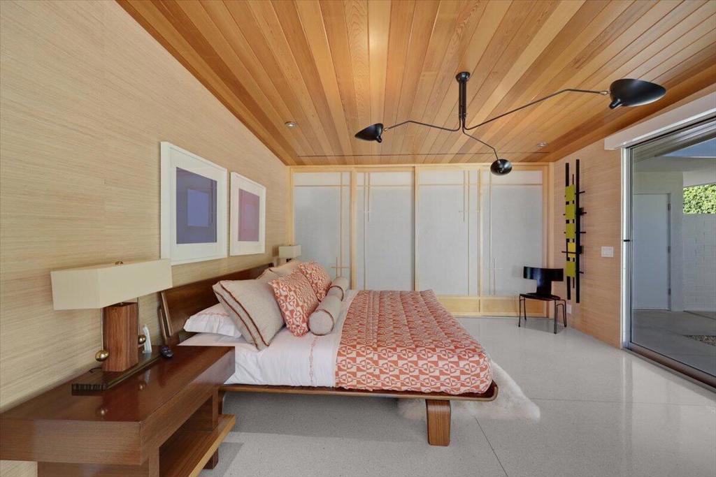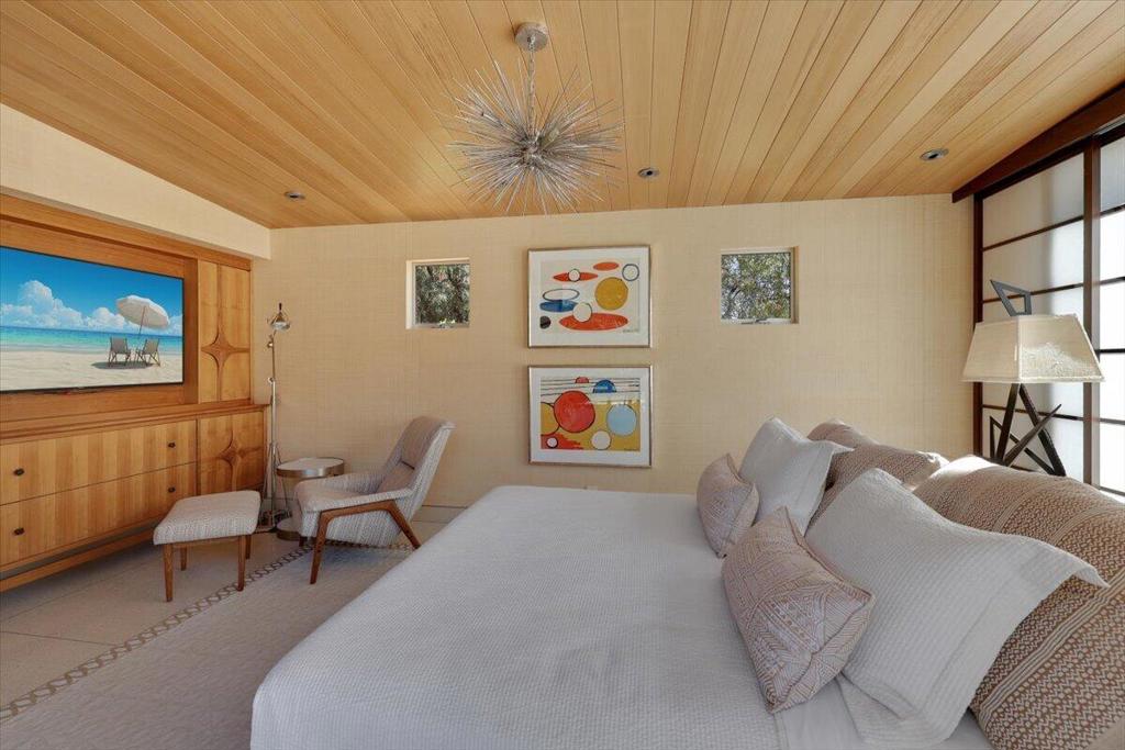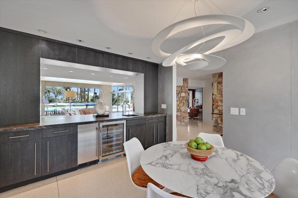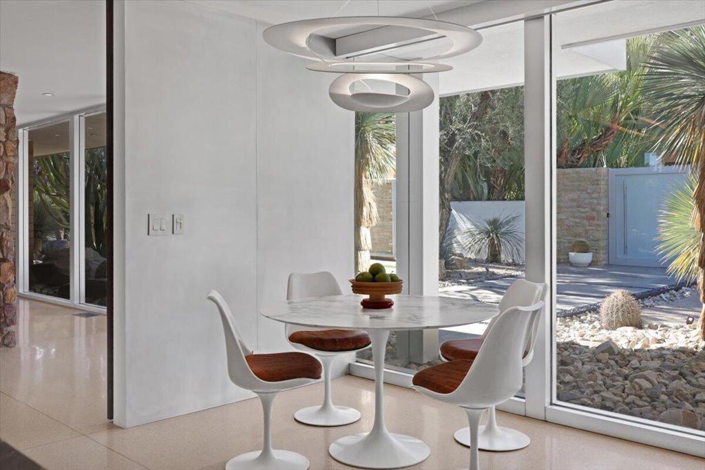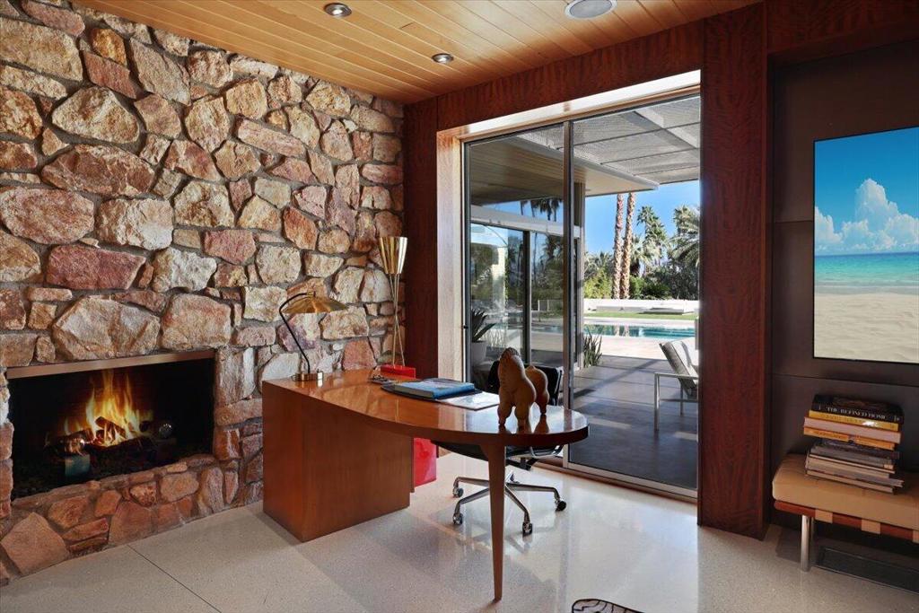 Extensively remodeled, restored and embellished by an owner with a keen eye for impeccable Mid-Century Modern design, this 1957 Thunderbird Heights estate in Rancho Mirage is available for the first time in more than 17 years. The turnkey residence includes premium furnishings, complete with vintage, bespoke and designer pieces. Walled and gated, private grounds extend approximately 32,670 square feet and cater to memorable entertaining with a zero-edge pool with Baja entry, spacious patios, a shade pavilion and sweeping mountain and valley views. Inspired landscaping reveals the talents of Marcello Villano, who has created stunning gardens including those at Jennifer Aniston's Bel Air home. Interiors framed in walls of glass measure nearly 4,900 square feet and host five bedrooms and five- and one-half baths. Renowned throughout the Coachella Valley, architect Howard Lapham created the single-level residence, which offers outstanding scale and impressive interiors from designer Sheldon Harte. Views to the backyard and beyond greet guests in the foyer, which introduces gallery-sized living areas with high ceilings, poured-in-place terrazzo flooring throughout, original stone walls, Venetian plaster and custom lighting. The living room displays a fireplace and beautiful vistas, an intimate den presents a walk-in wet bar and leather-paneled wall, and the kitchen blends period style with modern convenience. Details include cedar ceilings in select locations, furnishings from Knoll, Artemide light fixtures, glass tiles imported from Italy, and Kelly Wearstler wallpaper. Showcased on the pages of ELLE Decor, this era-defining home treats everyone to comfort and privacy. A detached two-room guest house is privately situated close to the outdoor amenities. The primary suite offers two bathrooms, a stainless-steel soaking tub, cork-lined dressing room, and an exterior patio with rain shower. The estate's exceptionally exclusive address within guard-gated Thunderbird Heights is moments from Thunderbird Country Club's famous 18-hole golf course, and only minutes from downtown Palm Springs, its international airport, and endless recreational opportunities across the valley.